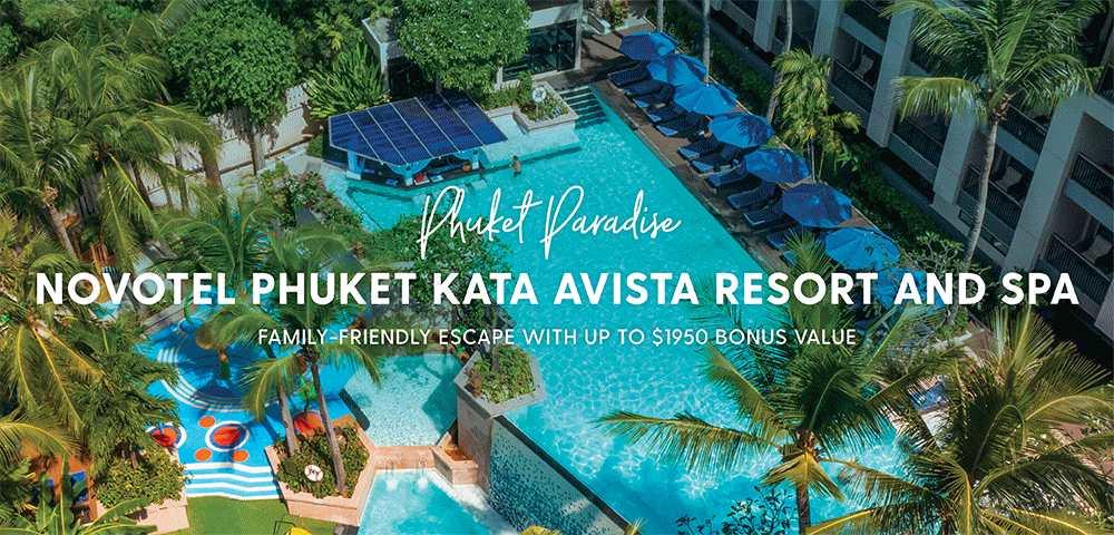 Overlooking pristine white sands and the turquoise waters of the Andaman Sea, Novotel Phuket Kata Avista Resort and Spa is your hilltop holiday paradise. Particularly popular amongst families, this five-star resort delivers sparkling multi-tiered pools, fun-filled kids’ zones and relaxed all-day dining. Making holiday planning simple, we’ve paired your stay with up to $1950 Bonus Value, including return flights and transfers, daily buffet breakfast, choice of daily two-course lunch or dinner, daily cocktails, AUD$150 Wine, Dine and Spa credit, and much more.